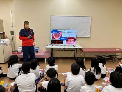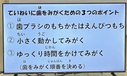 今日は体重測定にあわせて、歯の磨き方を渡辺先生に教えていただきました。三つの磨き方ポイントを守って、歯を大切にしようね!