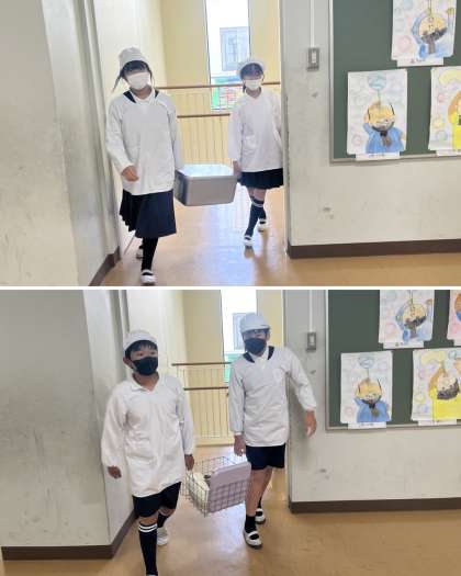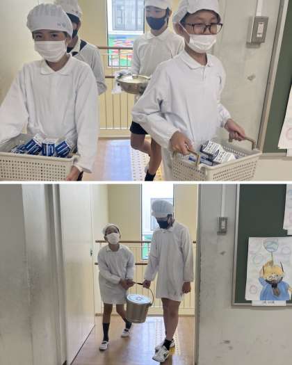 給食の準備 6年生 公開日 2024/11/11 更新日 2024/11/11 6年生 今回は普段の様子を上げさせていただきました。 手を洗い、マスク・エプロン・帽子を身につけて給食を教室まで運んでいる様子です。 案外簡単そうに見えますが、バランスを保って大おかずの中身をこぼさずに運ぶのには、2人の息が合っていないと難しいです! いいね(0)