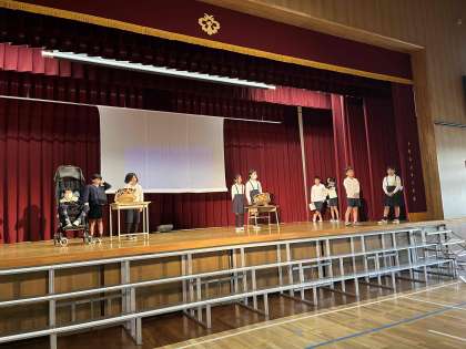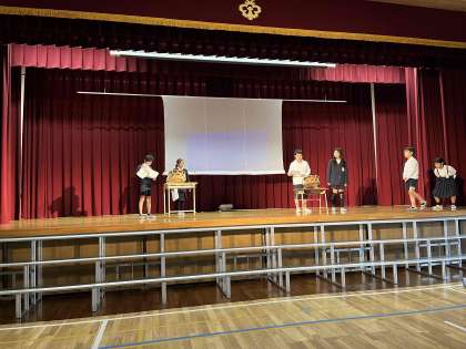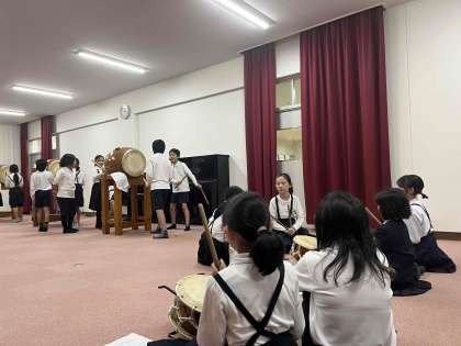 太鼓の作られ方について調べたり、太鼓の演奏をしたりしています。