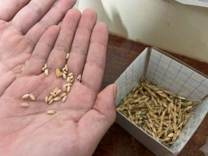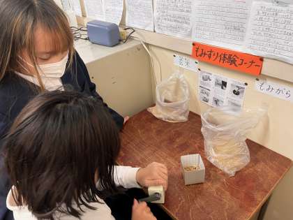 2年生と一緒に脱穀した稲を「もみすり」しています。大きな機械でする「もみすり」は後日みんなで行いますが、今は小さなもみすり機でもみすり体験をそれぞれおこなっています。