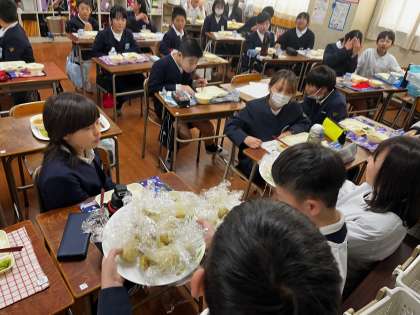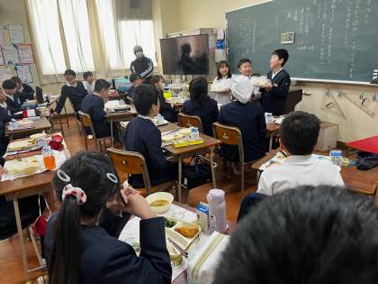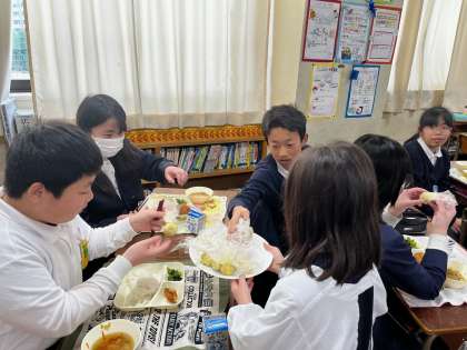 給食時間になり、5年生が楽しく食べていると…そこへ、突然の訪問者が現れました!