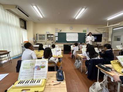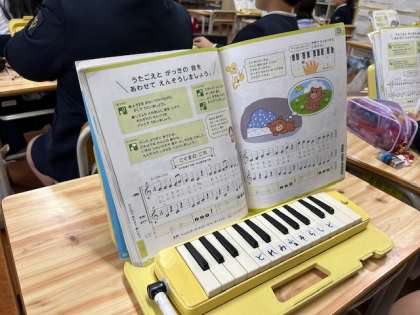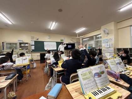 鍵盤ハーモニカで「こぐまの二月」を演奏している様子です。三つのパートにわかれて、音の重なりを感じることができました♪