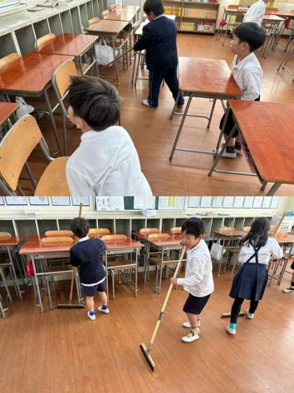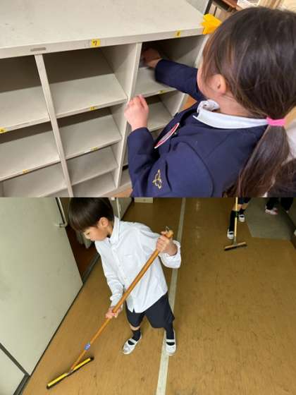 「こんなに机が大きいの!」「掃除用具箱の中がきれい!」など、色んな声が飛び交いながら、とっても嬉しそうに掃除をしていました!