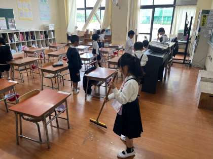 ほうきやちりとりの使い方、ぞうきんのしぼり方などを学習し、いよいよみんなで掃除です!
