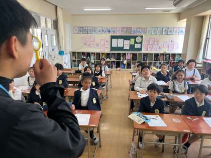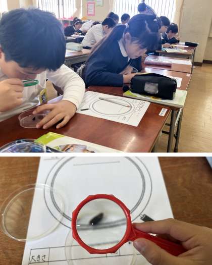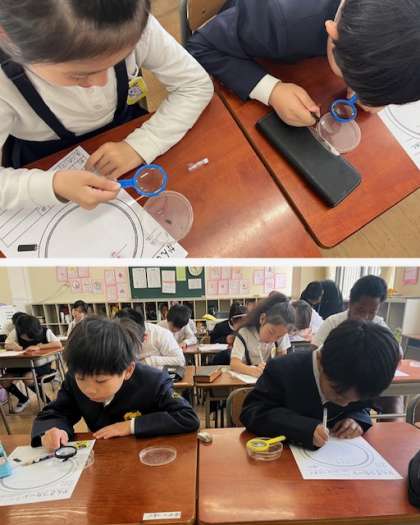 理科の学習です。虫めがねを使って、ヒマワリ、ホウセンカ、マリーゴールドの種をじっくり観察します。