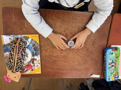初めて方位磁石を触ってみて、くるくる回るハリに苦戦しながら北を探しています。