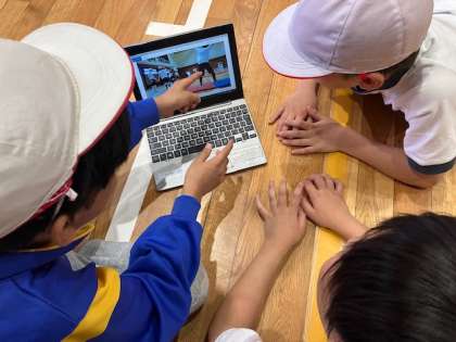 パソコンを使って友だちの動画を撮り、良いところや改善点を見つけて話し合いをしています。みんなでアドバイスしあう姿がとても素敵でした。