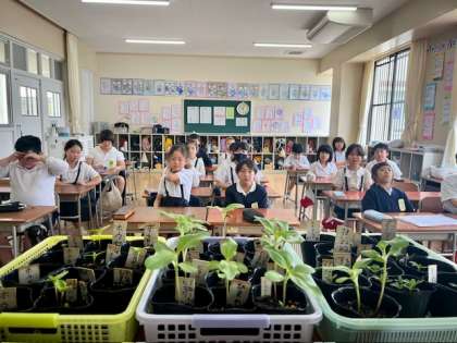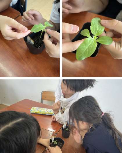 ヒマワリ、ホウセンカ、マリーゴールドの子葉の観察をしました。ギザギザしている葉や丸い葉など、花によって違うこと、また、子葉かどうかで形が違うことに気づきました。
