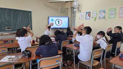 「地球温暖化の原因・その結果どうなるのか」という話を聞いたあと、クイズをしたり、タブレット(アプリ)を使って、地球温暖化が進んだ世界を擬似体験をしたりしました。