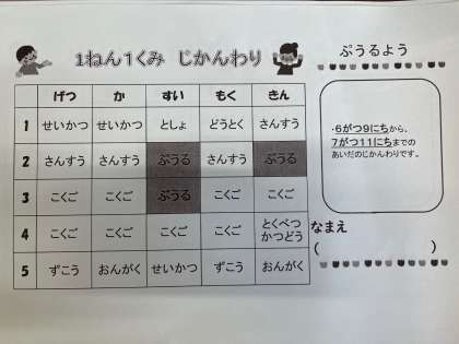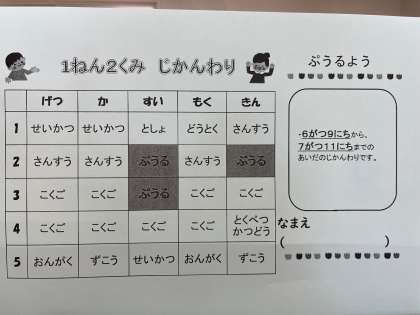 また、1組と2組でじかんわりの内容も違いますので、気をつけてください。