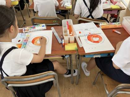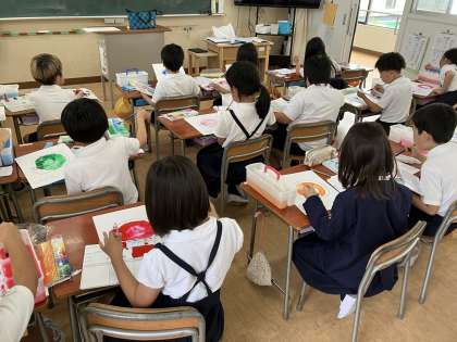 絵の具の技法としてグラデーションの練習をしています。今回はカタツムリを1色で、水の量を変えて塗り分けました。