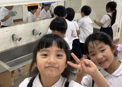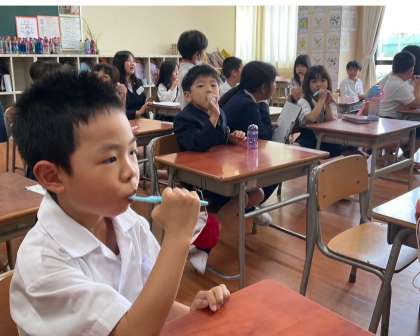 給食後、食べ終わった子から、すぐに歯みがきをしている1年生ですが、、、歯みがきタイムもきちんと座って歯をみがいてくれています^^