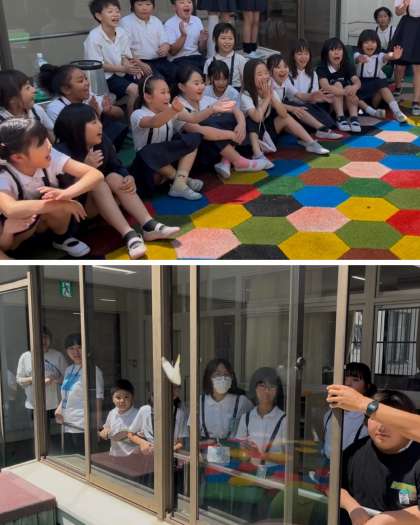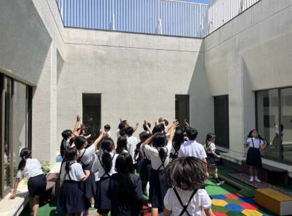 タマゴから育てていたモンシロチョウが羽化したので、虫カゴから放つセレモニーが行われました。