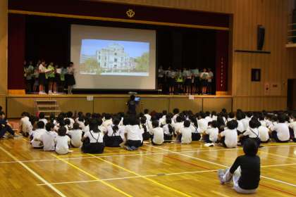 6年生より戦争で広島・長崎に原子爆弾が落とされたことや、原爆の被爆者である佐々木禎子さんが、「折り紙で千羽鶴を折れば元気になる」と信じて折鶴を折っていたことを発表してもらいました。