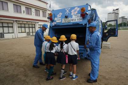 特別にパッカー車のボタンを自分たちで押して、実際にごみをつぶしてみたり、運転席に乗せてもらったりするなど貴重な体験をさせていただきました。