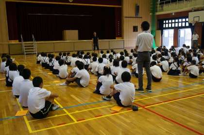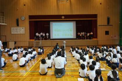 式中はその雰囲気も一転。蒸し暑い講堂で、校長先生の話を最後までしっかりと話を聞くことができました。また、代表委員会から8月6日の平和人権集会についての発表があり、戦争の悲惨さや平和の大切さについて、この日にみんなで考えようと呼びかけました。