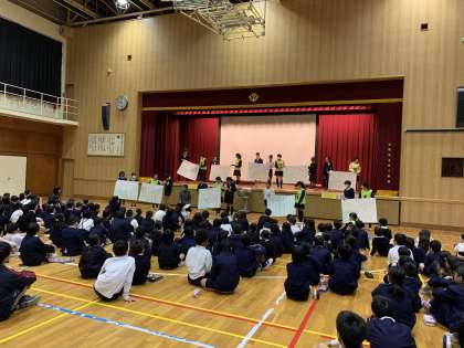児童朝会の後、「栄小ハートフルタイム」を実施しました。その中で、一人ひとりが考えた「あいさつ標語」をたてわり班で発表しました。6年生は、自分から発表の見本を示したり困っている友だちに優しく教えてあげたりするなど、学校のリーダーとしてがんばる姿が見られました。