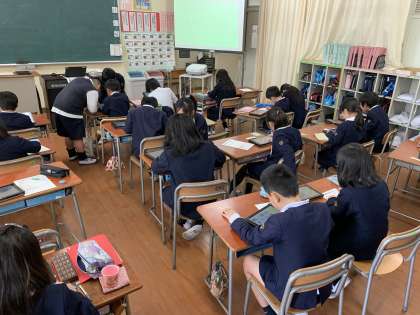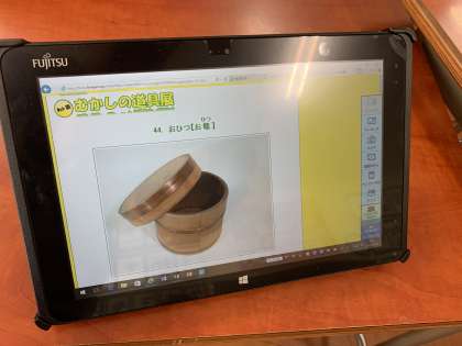 3年生が、タブレットを使って「昔の道具や遊び」について調べています。