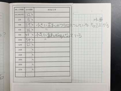 水を熱したときの温度変化とそのときの様子をノートに記録しています。