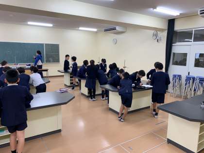 4年生が理科室で理科の実験をしています。