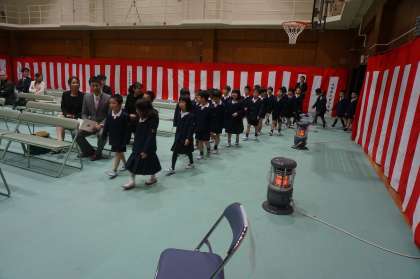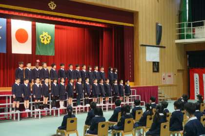 2年生の子どもたちは、1年生のために「お祝いのことば」のプレゼントと「みんなでいきいき」を歌いました。