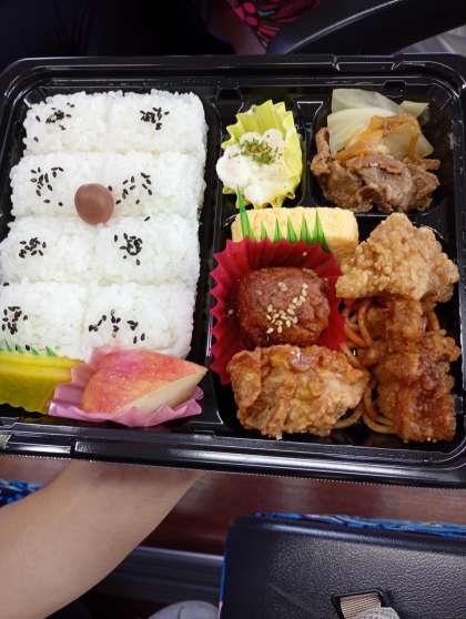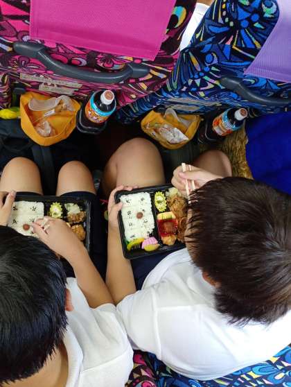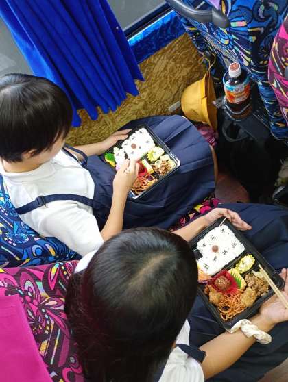 見学前の昼食タイム、お弁当を食べています。