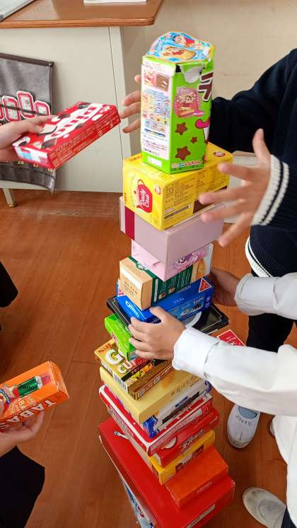 ご家庭の協力によりたくさんの箱が集まり、楽しく学習することができました。引き続きご協力よろしくお願いします。