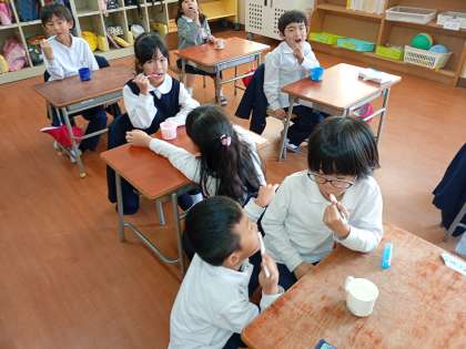 クラスにいる歯みがき名人さんたちが、ていねいに歯みがきできているかお友達の歯みがきを一生懸命チェックしてくれています。