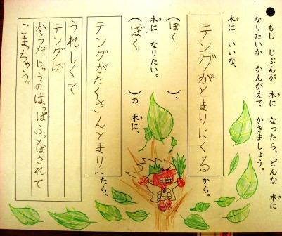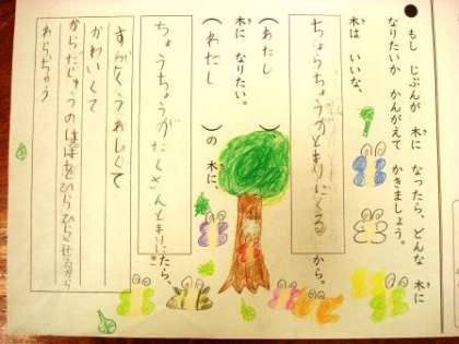 国語で「木」という詩を学習しました。もし、自分が木になったら、どんな木になりたいかを考え、詩を作りました。「自分の木にかぶとむしが、来てほしいな」「ちょうちょが、来てほしいな」など、想像をいっぱいふくらませて書きました。