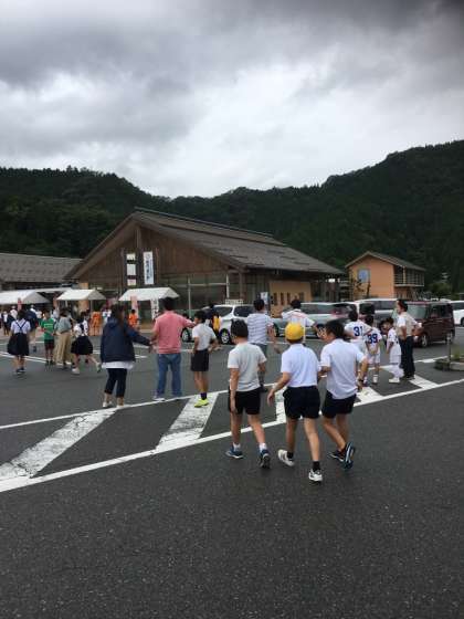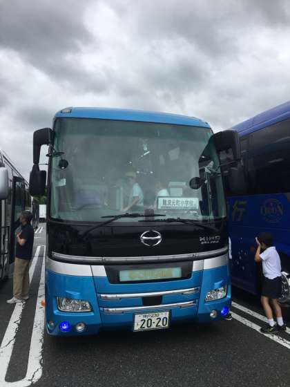 但馬のまほろばで2回目のトイレ休憩。天候は時折雨を感じる程度。塩草立葉小学校のバスも一緒でした。