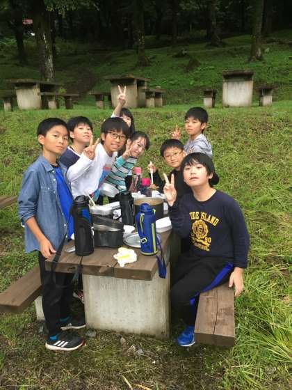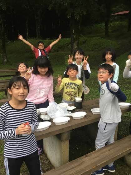カレー実食。ほとんどの子がおかわり。「美味しい!」の声が山合いに響きわたりました。
