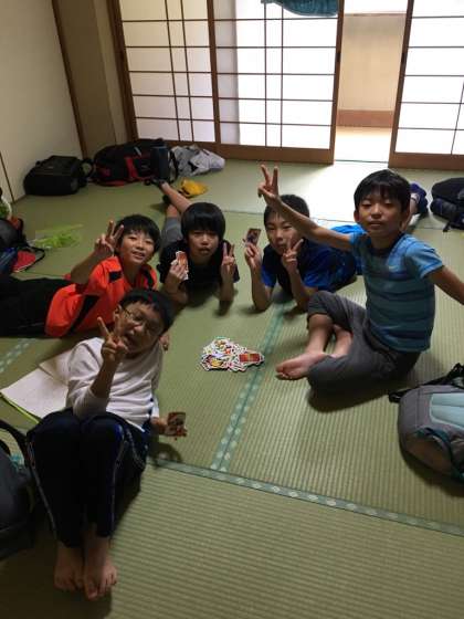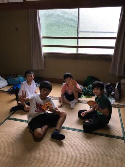 山頂から下山途中で昼食の弁当を食べ、エネルギーを補給し午後1時30分に宿舎に到着。午後3時からのアイスクリーム作りに備えて各部屋で休憩です。