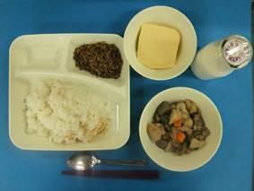 今日の給食は、「ごはん、牛乳、卵どうふ、豚肉とさといもの煮もの、おかかなっ葉」です。れんこんやこんにゃく、三度豆など、かみごたえのある食品が使われていたせいか昨日と比べて一段とかむ回数が増えました。