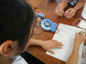昨日に引き続き、かみかみセンサーで給食1食分をどれだけかんで食べているか4人の子どもたちが挑戦しました。