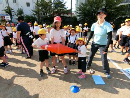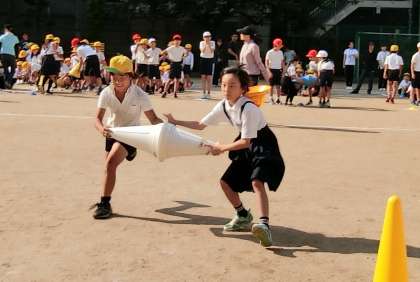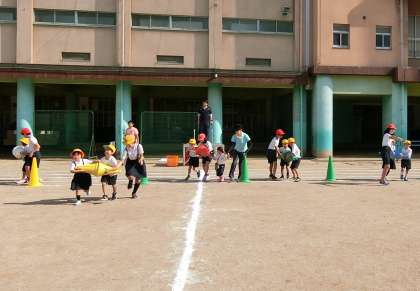 たてわり班で、運動会で実施する全体競技「カプセルボール」の練習をしました。