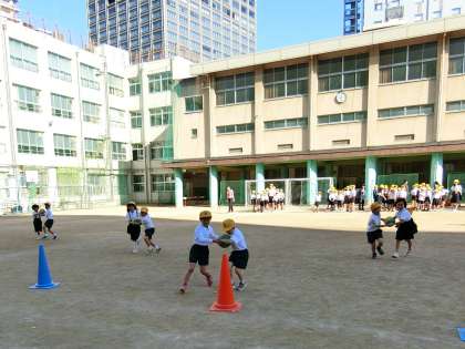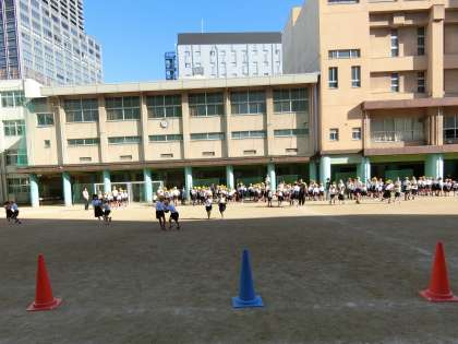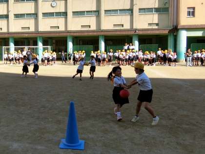・各たてわり班で二人一組になり、ボールを挟んでコーンを回ってリレー。