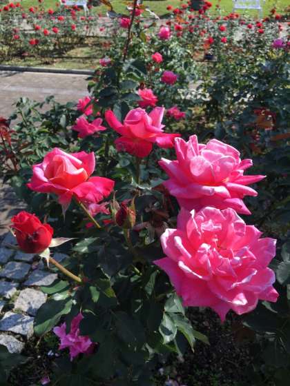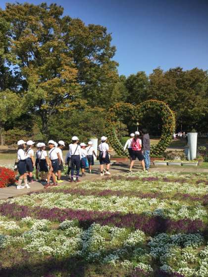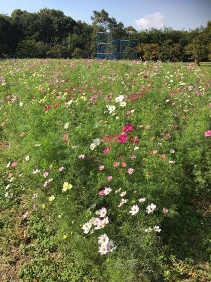 ○秋晴れのもと、たくさんの花が咲いています。