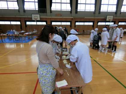 ・校区内にあるラーメン「一風堂」の店員さん2名に来ていただき、餃子の作りをしました。