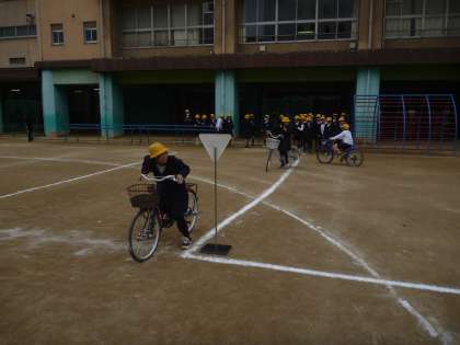 運動場に模擬道路を用意し、2時間目には1・2・3年生が歩行練習を行いました。3時間目には4・5・6年生が自転車の乗り方や点検箇所について学習しました。