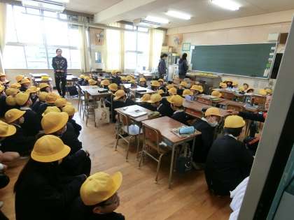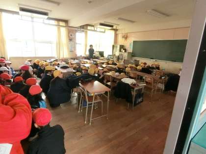 ・津波警報発令を想定して1年3年は5年の教室へ2年4年は6年の教室へ避難しました。