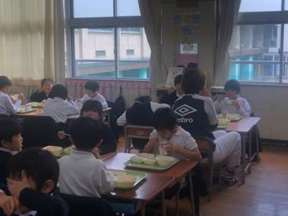 学校給食週間中は、給食調理員さんが各学級を訪れて、子どもたちと一緒に給食を食べる取り組みを行っています。今日は1年2組でした。