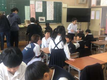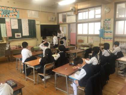 いつも給食室の前で優しく給食を手渡してくれる調理員さんですが、その時は帽子やマスクをしているので目元しかわかりません。でも、教室に来ていただいたこの日はお顔がよくわかるので、子どもたちも大喜びです。