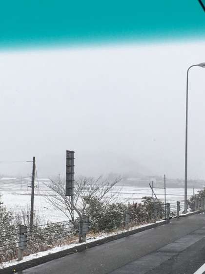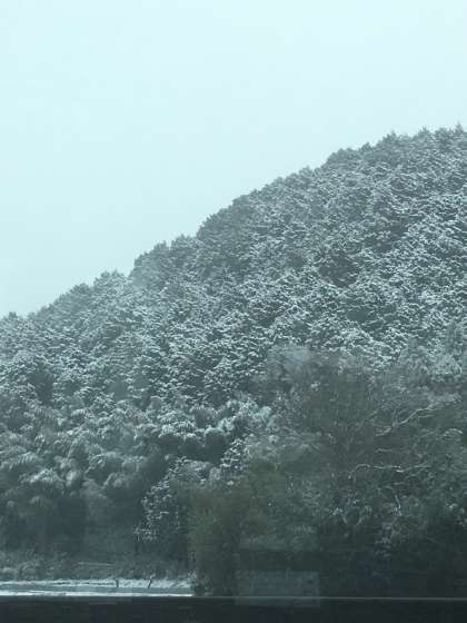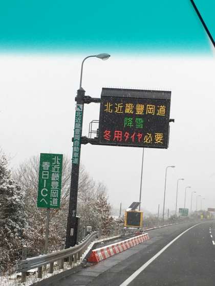○バスは高速道路を順調に走行しています。春日から北近畿豊岡自動車道にはいりました。雪が断続的に降っています。