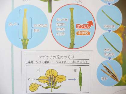 アブラナの花が咲き、花の真ん中にあるめしべのまわりにある