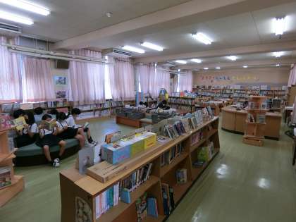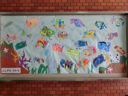 ・今日から7月、玄関掲示は2年1組が担当。ふしぎな魚たちが楽しげに泳いでいる姿は涼しさを届けてくれています。