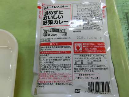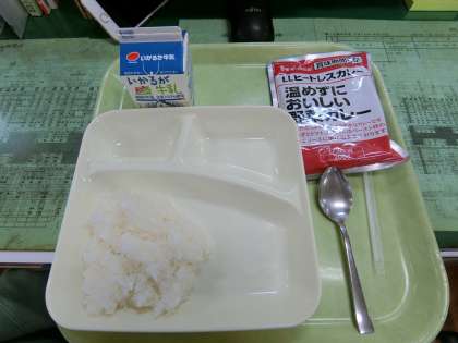 ・本日、給食室において停電が発生し、調理ができない状況になったため、予定していました「さけのしょうゆ風味焼き」等の副食の提供を中止し、代替えとして「野菜カレー(ヒートレスカレー)」を提供いたしました。