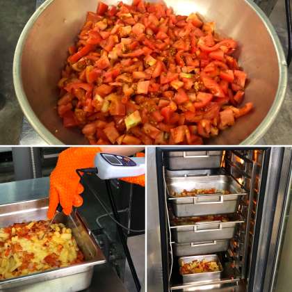 画像1:本日使用したトマトです。焼き終わりに温度を確認しています。具材を敷き詰めたミニバットを焼き物機に入れ、一度に焼きます。