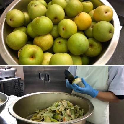 画像2:全校分の梨です。芯をとり、皮をむいているところです。