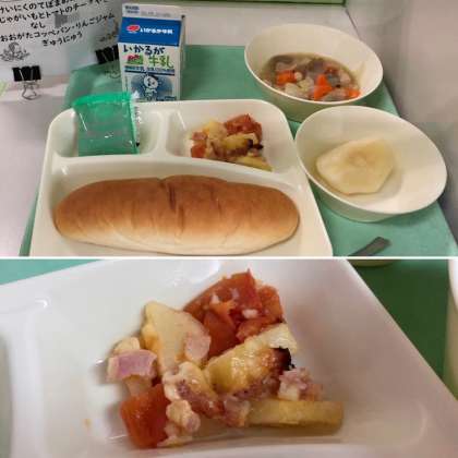 今日の献立は、鶏肉とてぼ豆のスープ煮、じゃがいもとトマトのチーズ焼き、なし(二十世紀)、大型コッペパン、牛乳です。