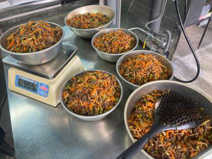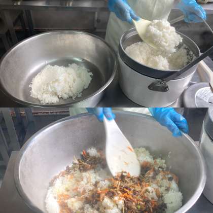 別釜で作った具材をクラスごとに計量し、炊き上がった学年の分から順に、ご飯と具材をたらいに移し、少しずつ混ぜていきます。